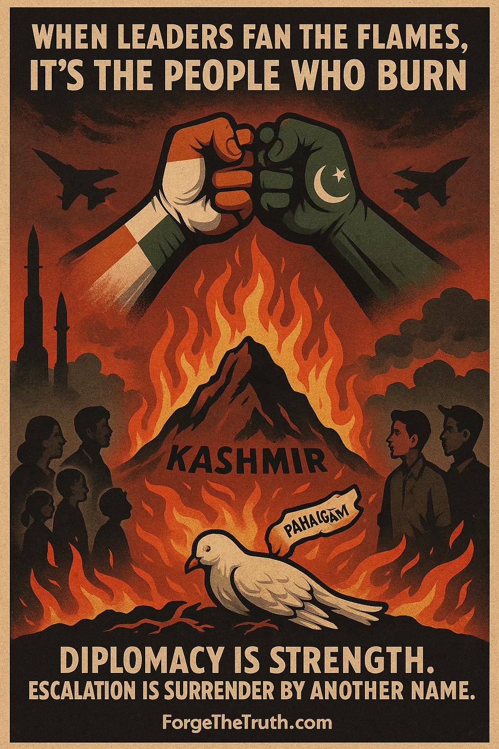 This poster imagines that moment of brinkmanship. Two fists clash over a burning Kashmir, while villagers from both nations look on, powerless. The flames do not distinguish between flags.