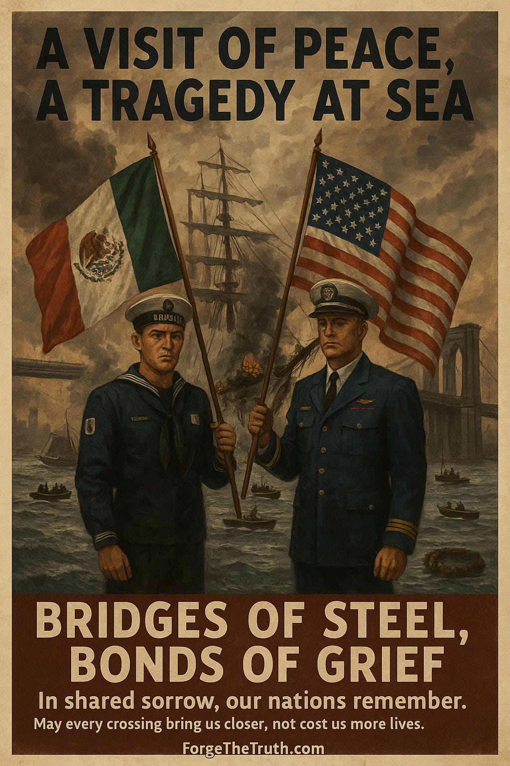 Our latest poster, “Bridges of Steel, Bonds of Grief,” reimagines the tragedy through the lens of shared humanity. A U.S. Coast Guard officer and a Mexican sailor stand shoulder to shoulder, flags raised not in pride, but in mourning. Behind them, the smoke of the damaged vessel rises beneath the Brooklyn Bridge—both a literal and symbolic link between our peoples.