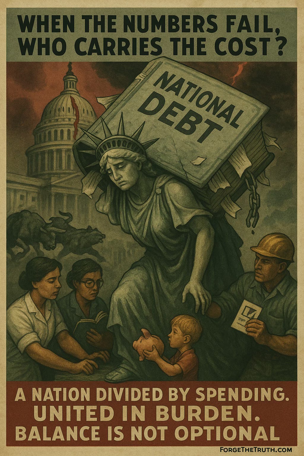 Today’s poster, “When the Numbers Fail, Who Carries the Cost?”, casts Lady Liberty as a weary figure shouldering a ledger too heavy to bear. Around her, ordinary citizens step in to help, nurses, engineers, workers, and even a child offering a piggy bank. This isn’t just symbolic. It’s a reminder that real people, not bureaucrats, absorb the impact of economic recklessness.