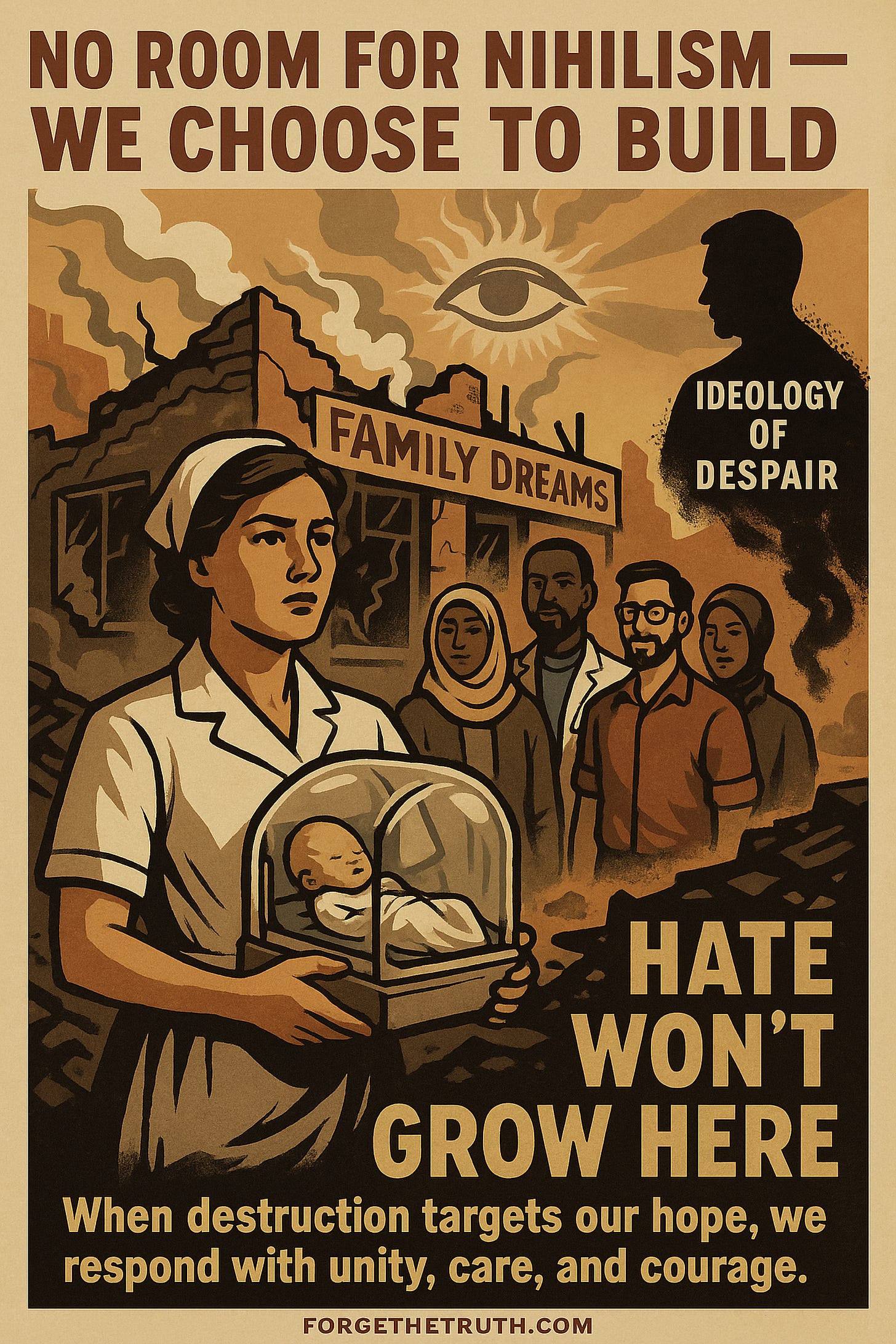“Hate Won’t Grow Here” reimagines that smoke-filled scene with something stronger than fear: people. A nurse protecting life. A community showing up. Strangers linking arms, saying not today. Not to this place. Not to these people. Not in our name.