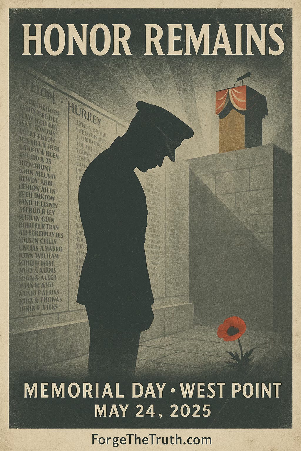 The poster above honors West Point’s values while inviting reflection: a lone cadet bows before names carved in stone; a single poppy stands firm; a distant podium reminds us that ceremony should uplift, not overshadow, remembrance.