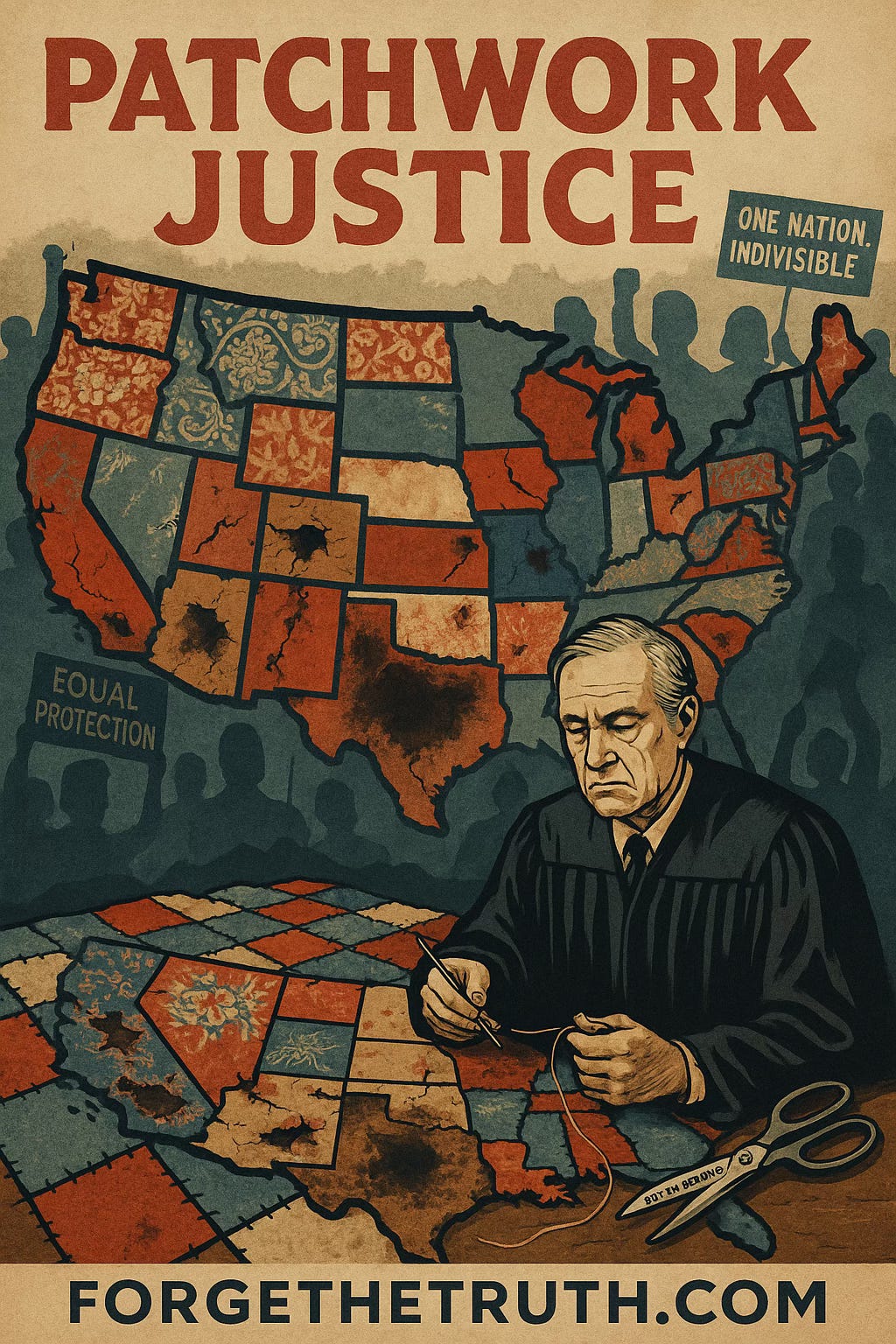 A weary judge holds a needle but looks on helplessly, as the SCOTUS RULING scissors sit ominously nearby. In the background, shadows of citizens rise, holding signs that read “EQUAL PROTECTION” and “ONE NATION, INDIVISIBLE.”