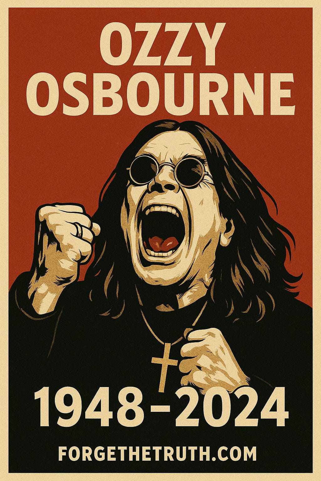 The new ForgeTheTruth.com memorial poster captures this spirit: Ozzy, fists raised, mouth open in a primal scream, as if defying death itself. The design echoes the vintage propaganda style of the mid-20th century, boldly declaring that while the man may be gone, the roar remains.