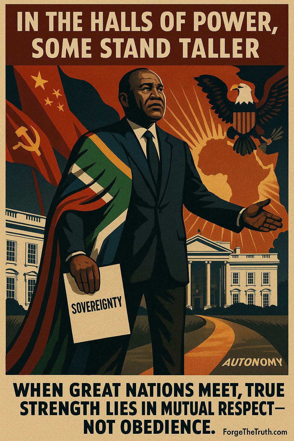 Today’s poster, The Lion Does Not Bow, captures this moment of defiance and dignity. At a time when smaller nations are often expected to fall in line, Ramaphosa’s presence was a quiet but unflinching declaration: strength is not submission.